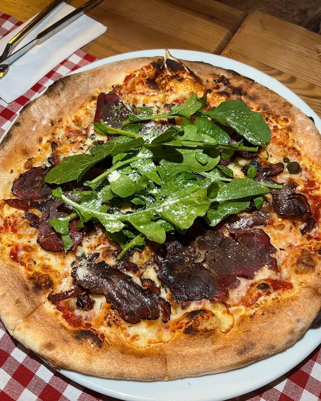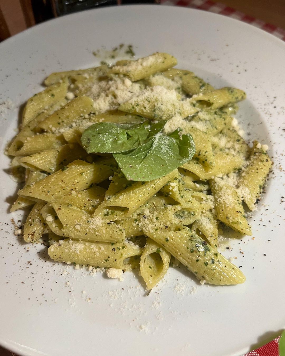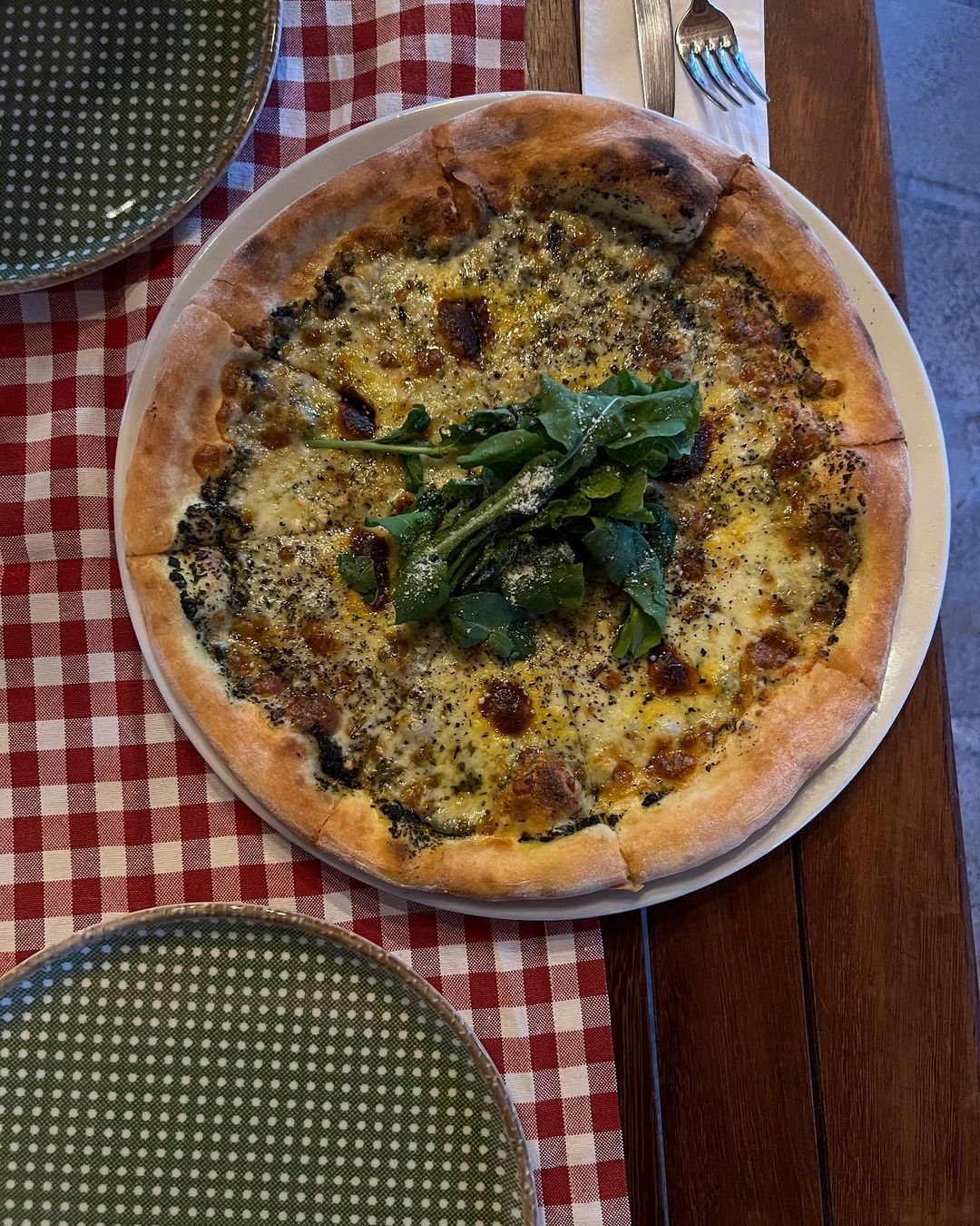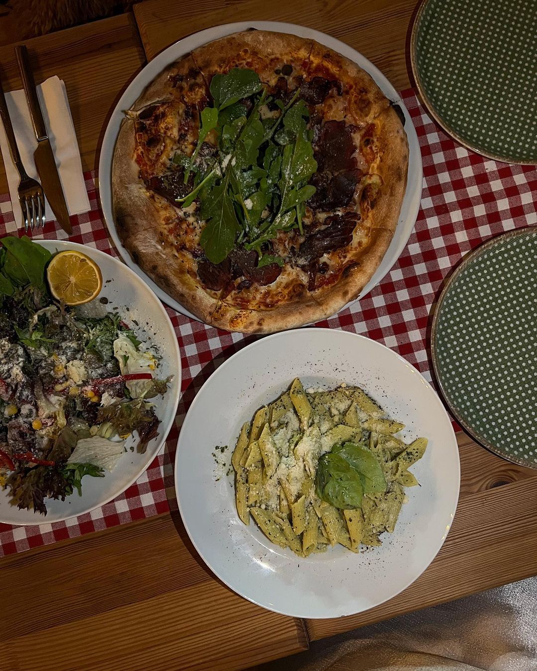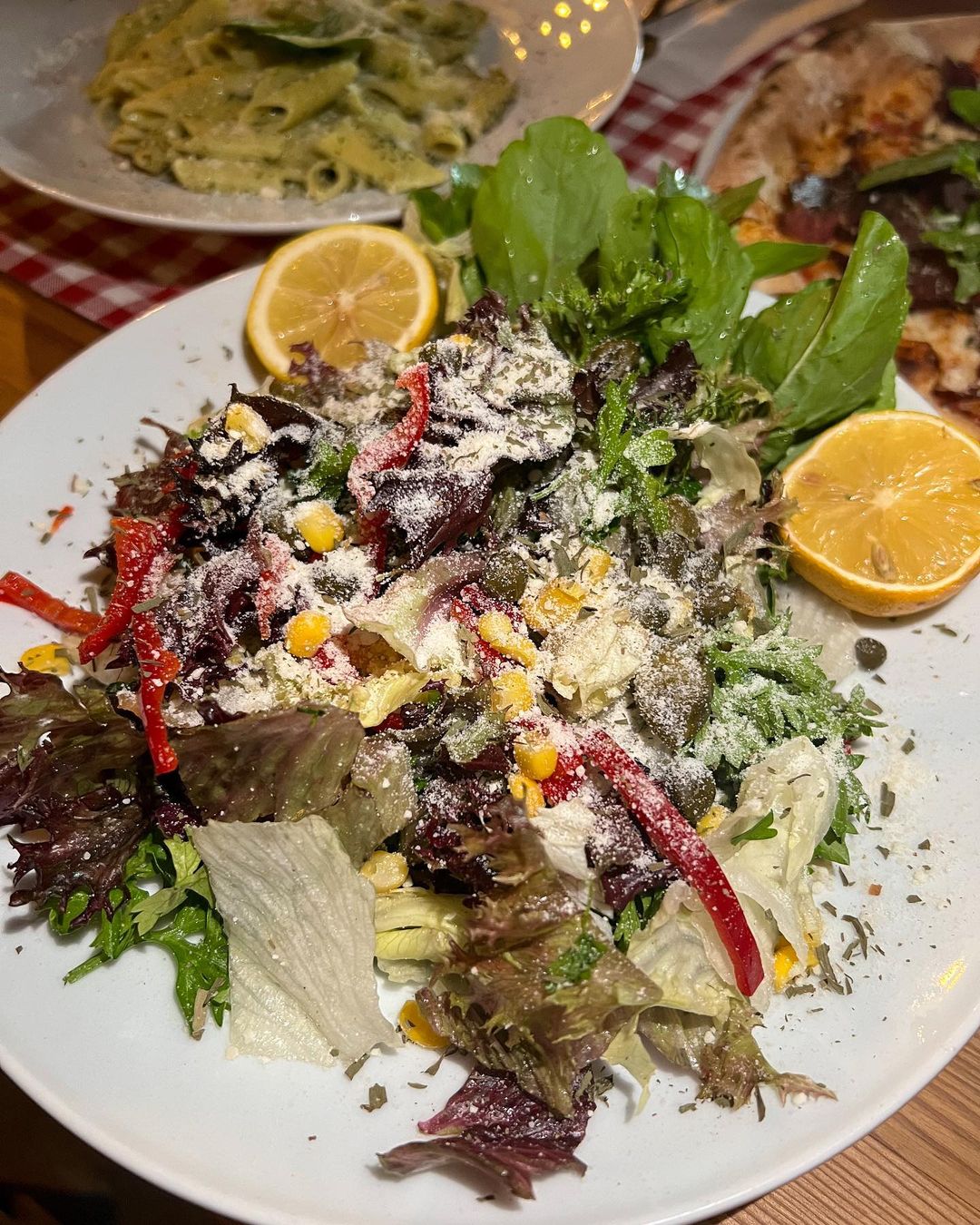 Pizza, makarna, tavuk veya etli ana yemekler, salata ve tatlılardan oluşan bir menüsü var. Tahtada yazılı menüyle masaları gezen tatlı çalışanları, İtalya havasındaki şefiyle çok keyifli bir mekan. Biz hem ilk hem de ikinci gidişimizde uğradık buraya. Pesto soslu makarna, peynirli salata, kuru isli etli pizzayı ilk gidişimizde, dört peynirli pizzayı da ikinci gidişimizde yedik. İlkinde çok aç olunca gözümüz dönmüş 1 pizza ve salata yeterli olacaktır orta açlıkta 2 kişiye bence. Biz makarnayı daha bol soslu seviyoruz, lezzetli ama bizce daha iyi olabilir. Salatanın malzemesi çok bol ama biraz içeriği karışık geldi bize. Dört peynirli de kuru isli etli pizza da çok lezzetliydi, içeriğine ve damak tadınıza göre seçim yaparsanız kesinlikle mutlu eder. Yani özetle makarna ve salatası da güzeldi ama bence menüdeki en iyi seçenek pizzalar.