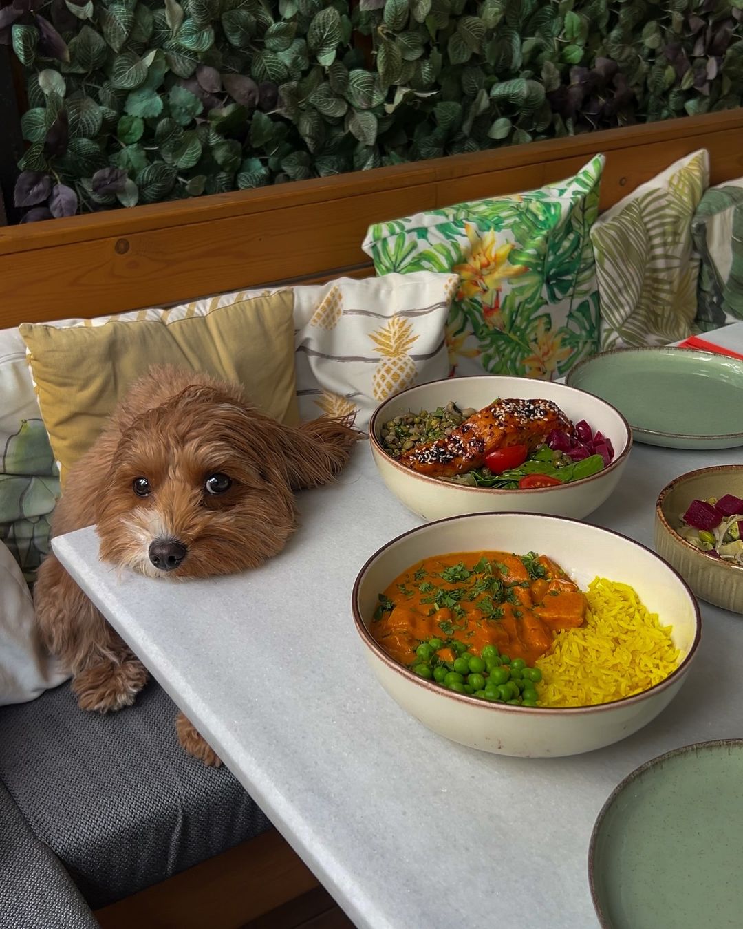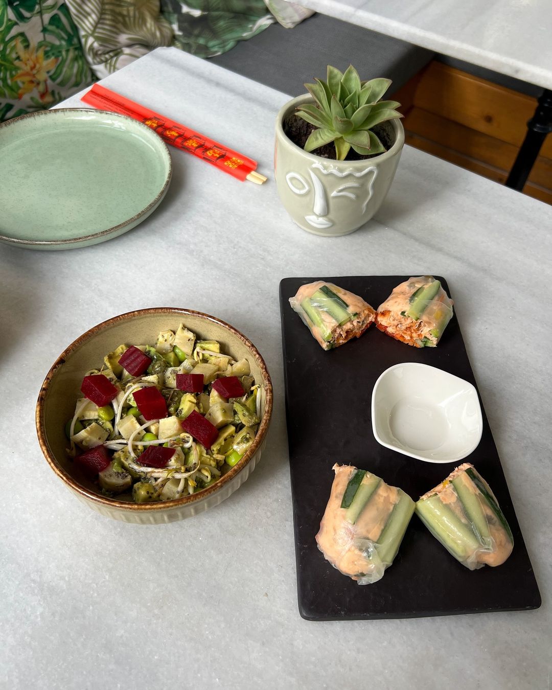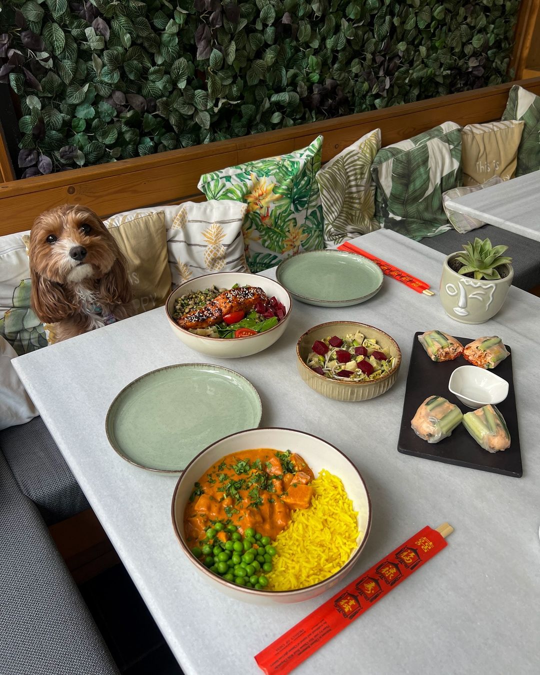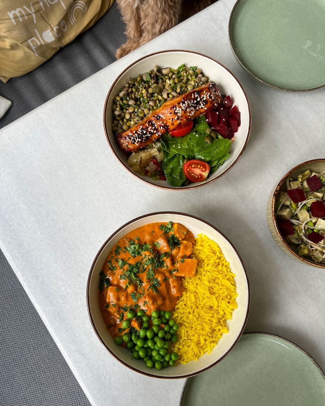 Biz başlangıçlardan çiğ enginar & avokado ile hazırlanan mini salata ve somonlu vietnam spring roll seçtik. Ana yemek bölümünden de somon inkase ile ben somondan devam ettim. Somon tabağı mesela normalde basmati ile servis ediliyor ama glütensiz seçenek isterseniz benim gibi karışık bakliyat salatalı da isteyebilirsiniz. Diğer yemek seçimimiz ise tavuk tikka masala oldu. Kaselerin içeriğine bakıp damak tadınıza göre seçimler yaparsanız kesinlikle çok memnun kalırsınız. Yemek sonrası yine sağlıklı madem diye kendimizi tutamayıp tatlı ile devam ettik. Vegan tiramisu ve peanut butter pie denedik, benim favorim peanut bitter oldu çokk güzeldi.