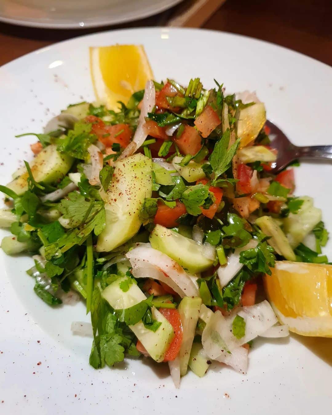 Gelelim yemeklere. Yanında bulgur pilavı ile servis edilen tandırda kaz, kiremit kebabı, şirin pilavı ve çoban salata siparişi verdik. Kaz eti bence biraz hindi etine benzeyen ama daha tuzlu bir et. Ben sevdim ama sürekli yiyebileceğim bir et değil. Onun dışında dana etinden yapılan kiremit kebabı müthişti. Masaya geldiğinde sıcacık olup üzerine hemen Kars kaşarı dökülüyor. Mis. Şirin pilavı ise zerdeçal ile hazırlanarak içine incir, ceviz, hurma ekleniyor. Böylece biraz tatlımsı bir pilav oluyor. Şirin pilavını da mutlaka evde yapacağız, çok sevdik. Salata bildiğimiz salata ama güzel malzeme ile hazırlanan temiz salata.