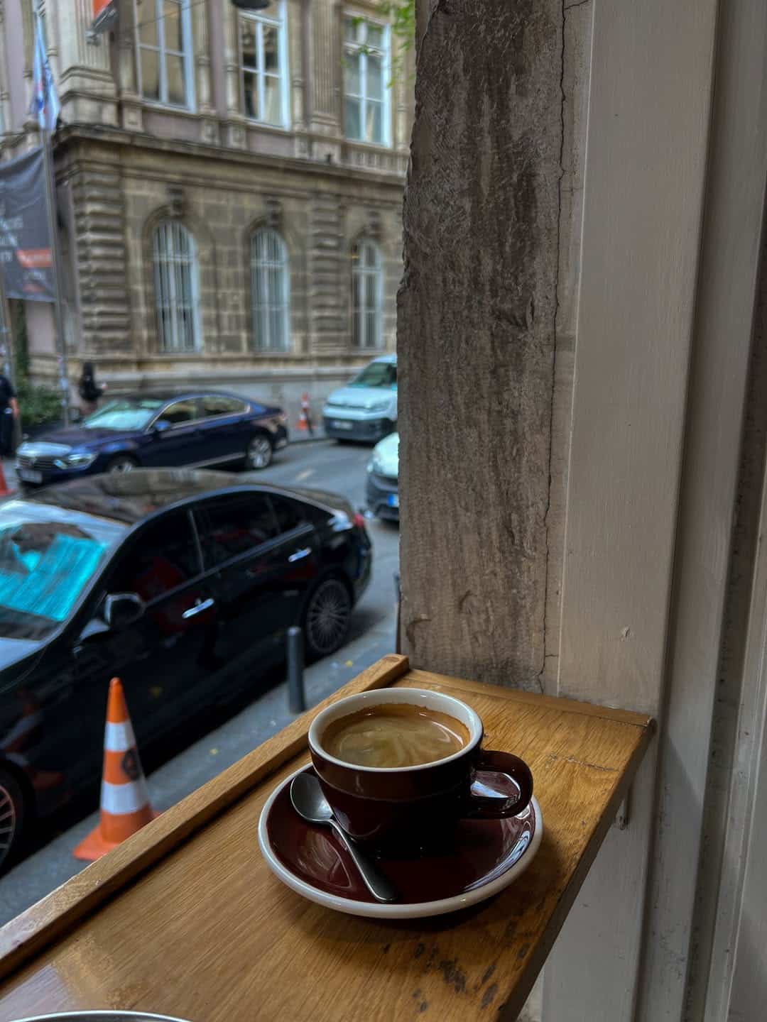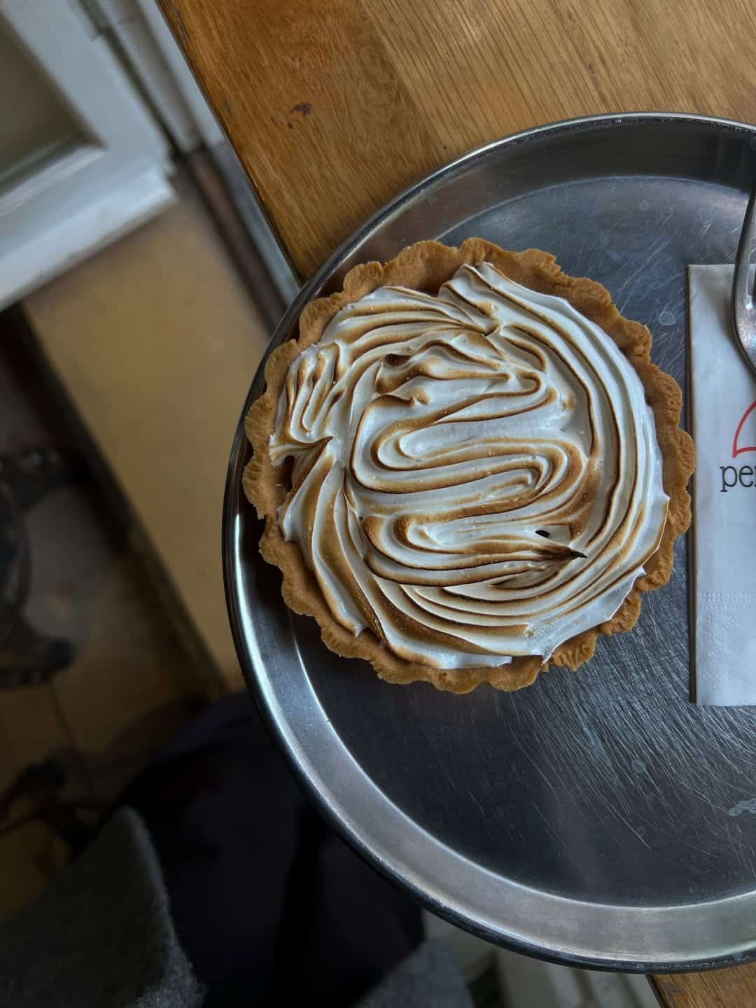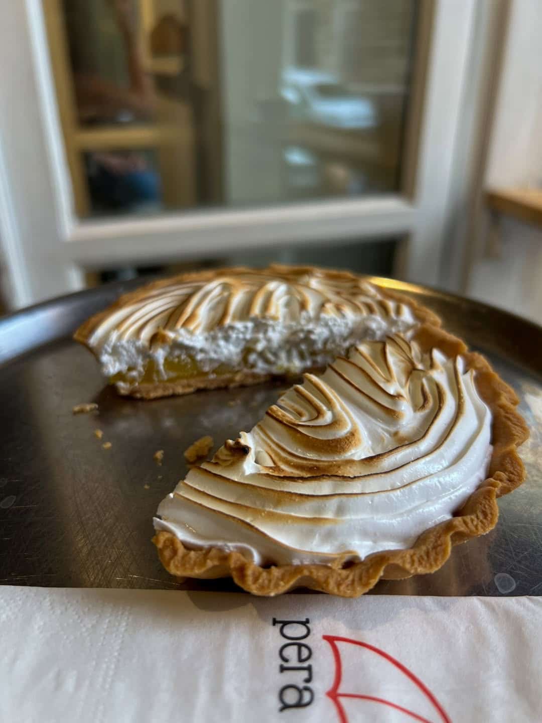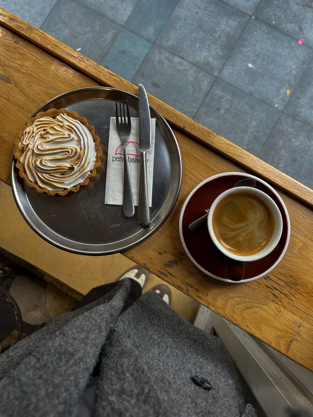 Bu kez gelin birlikte içeride oturalım. Cam kenarındaki o meşhur kırmızı tentenin altında yer bulunca sebepsiz mutlu olup kuruldum ben hemen. Siparişim klasik: Bir Americano, bir de limonlu tart. 🍋